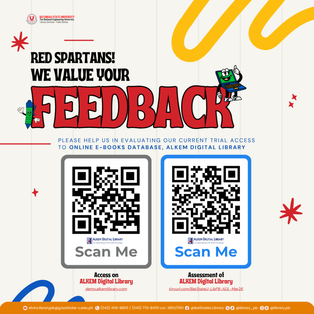 To our dearest Red Spartan patrons, students, and faculty, we seek your input to help us evaluate the 𝗧𝗿𝗶𝗮𝗹 𝗔𝗰𝗰𝗲𝘀𝘀 𝘁𝗼 𝗢𝗻𝗹𝗶𝗻𝗲 𝗘-𝗕𝗼𝗼𝗸𝘀 𝗗𝗮𝘁𝗮𝗯𝗮𝘀𝗲, 𝗔𝗟𝗞𝗘𝗠 𝗗𝗶𝗴𝗶𝘁𝗮𝗹 𝗟𝗶𝗯𝗿𝗮𝗿𝘆.